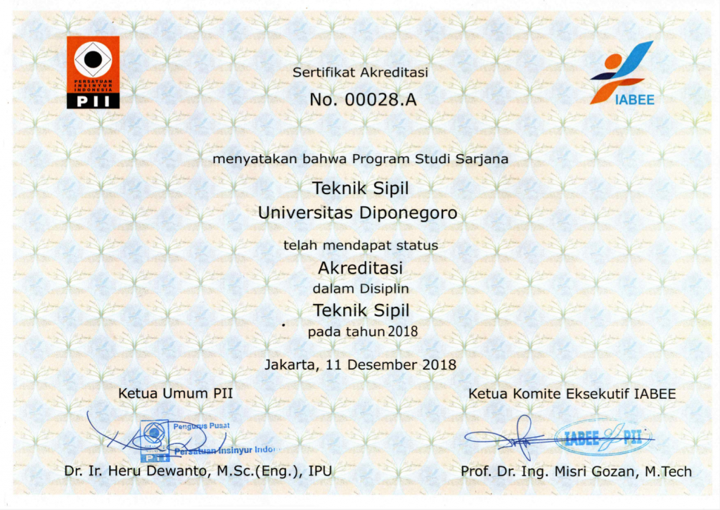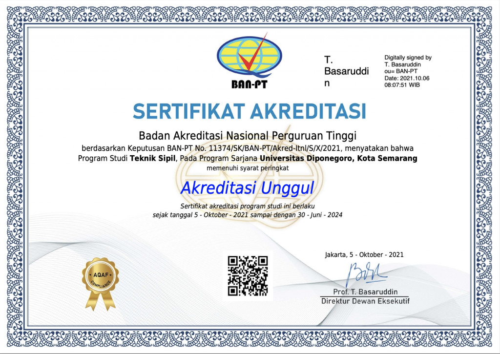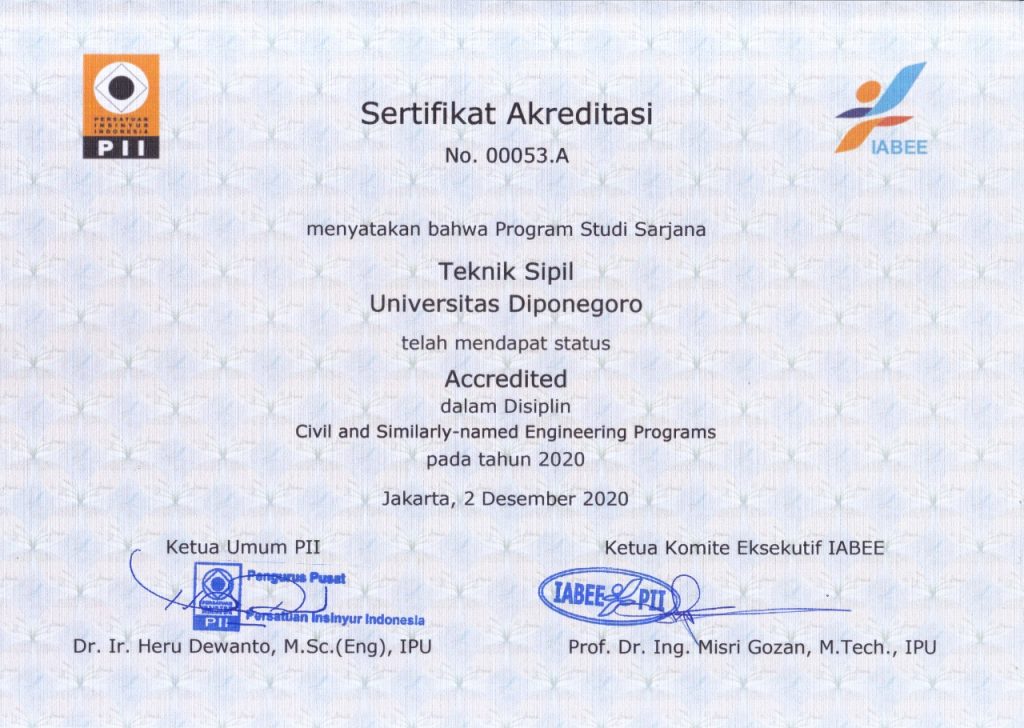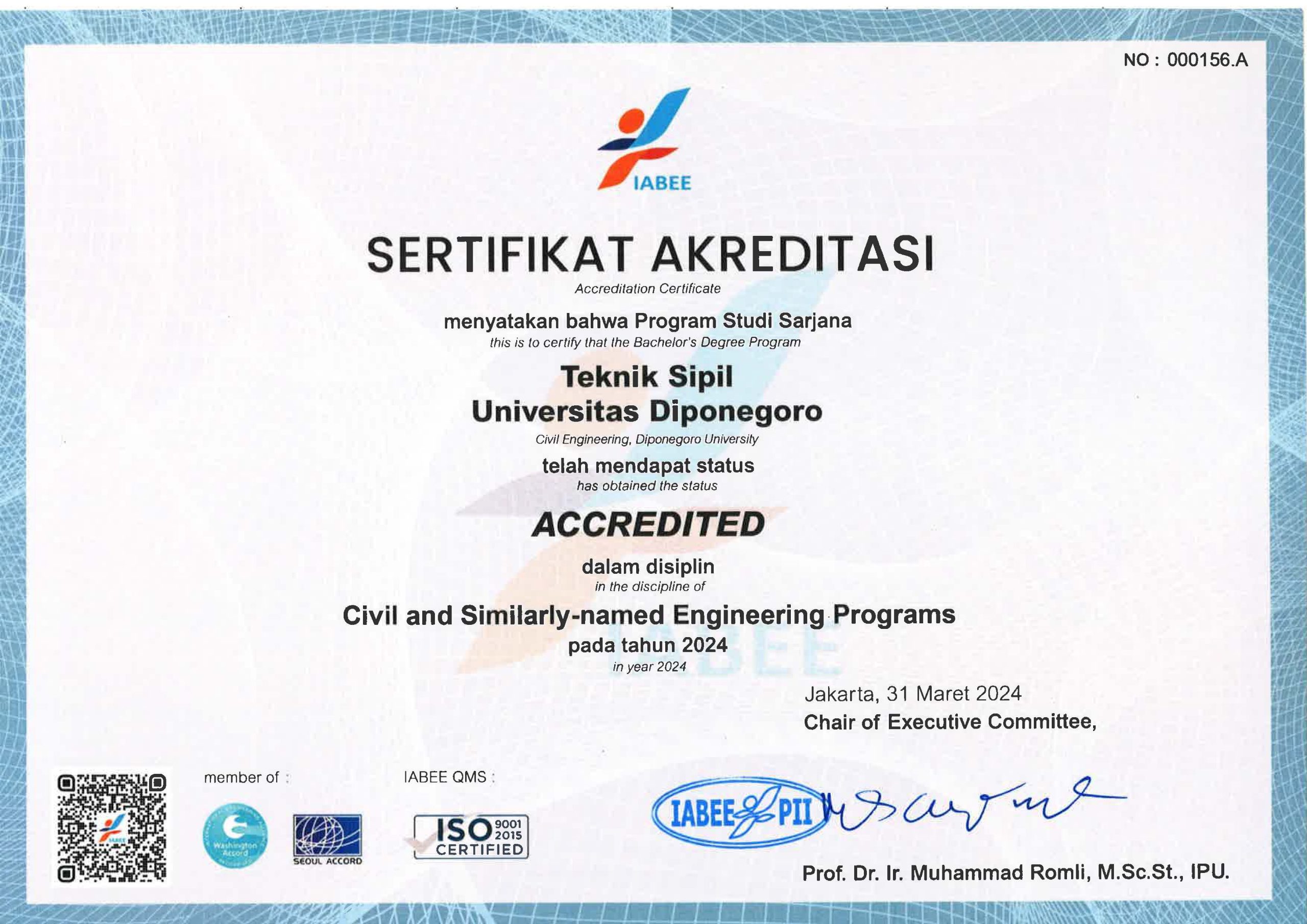 Sertifikat akreditasi oleh IABEE tersebut telah disetarakan oleh BAN-PT melalui SK nomor 11374/SK/BAN-PT/Akred-Itnl/S/X/2021 dengan hasil bahwa Program Studi S1 Teknik Sipil Universitas Diponegoro memiliki peringkat akreditasi UNGGUL.