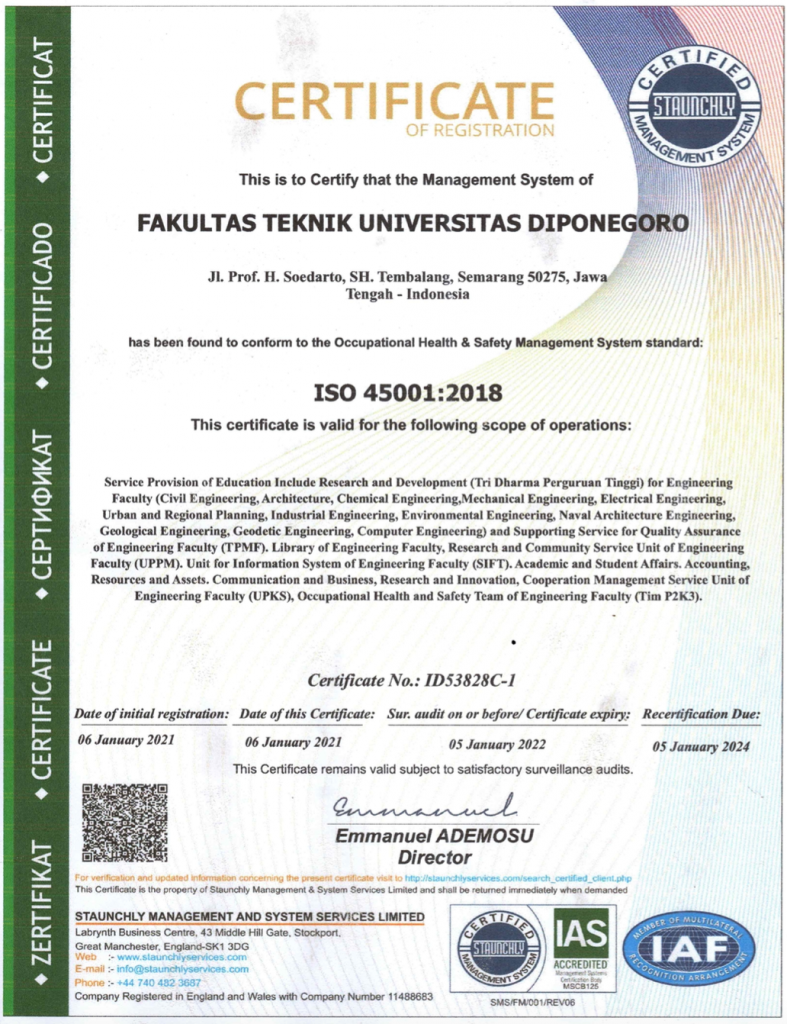 Sertifikat ISO 45001:2018 Fakultas Teknik UNDIP tahun 2021-2022