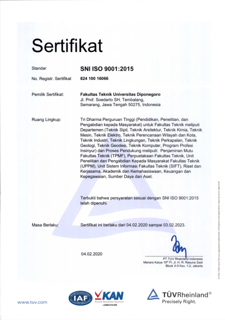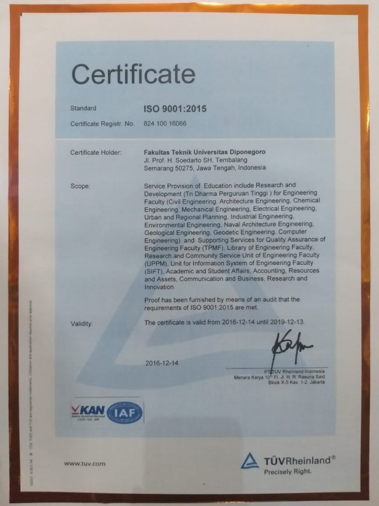 Sertifikat ISO 9001:2015 Fakultas Teknik UNDIP tahun 2016-2019