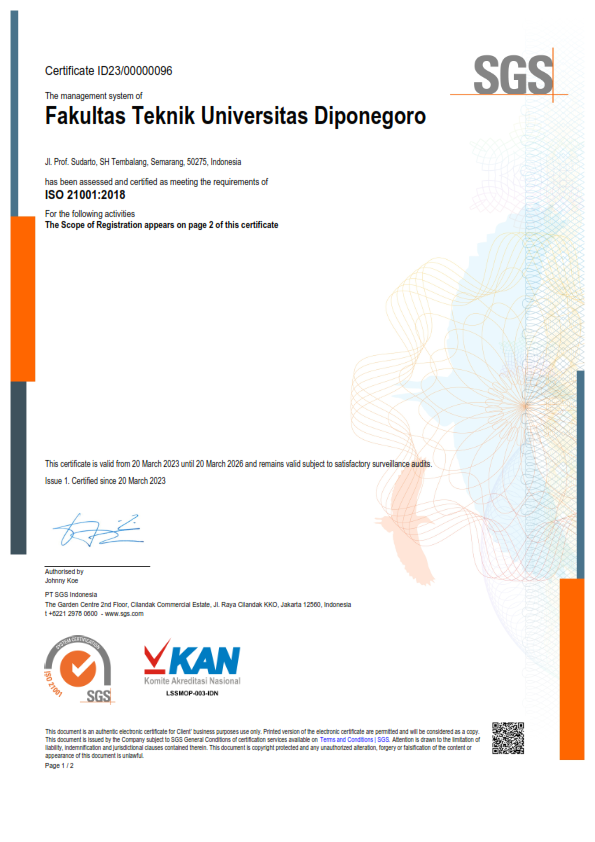 Sertifikat ISO 21001:2018 Fakultas Teknik UNDIP tahun 2023-2026