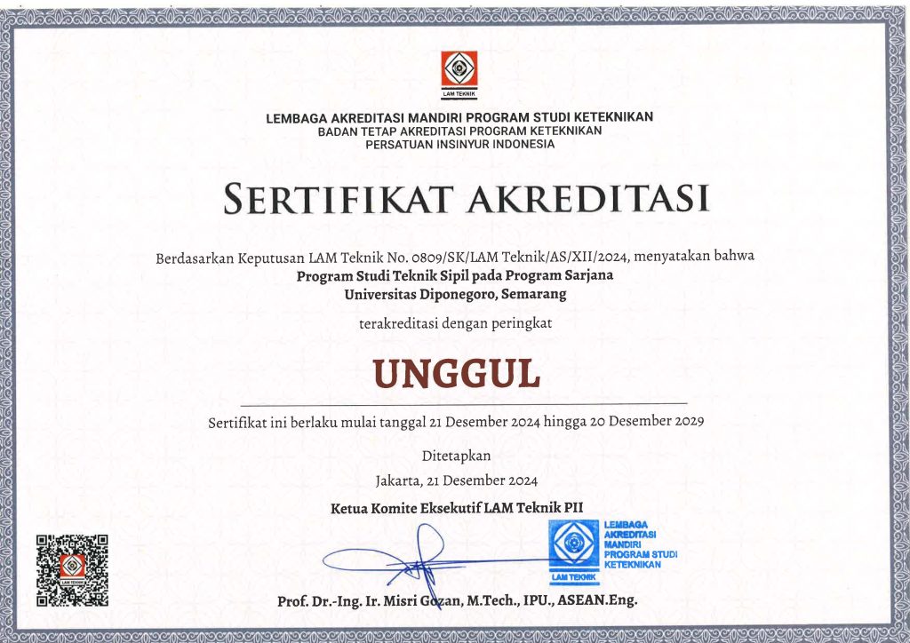 Departemen Teknik Sipil Fakultas Teknik Universitas Diponegoro telah terakreditasi oleh LAM TEKNIK dengan peringkat UNGGUL. Adapun rincian per Program Studi adalah sebagai berikut: