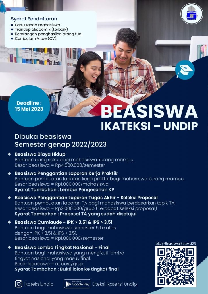 sipil.ft.undip.ac.id – Ikatan Alumni Teknik Sipil (IKATEKSI) UNDIP membuka peluang beasiswa kepada mahasiswa Teknik Sipil, berupa beasiswa biaya hidup, beasiswa penggantian laporan kerja praktik, beasiswa pengganti laporan tugas akhir, beasiswa cumlaude, dan beasiswa lomba tingkat nasional.