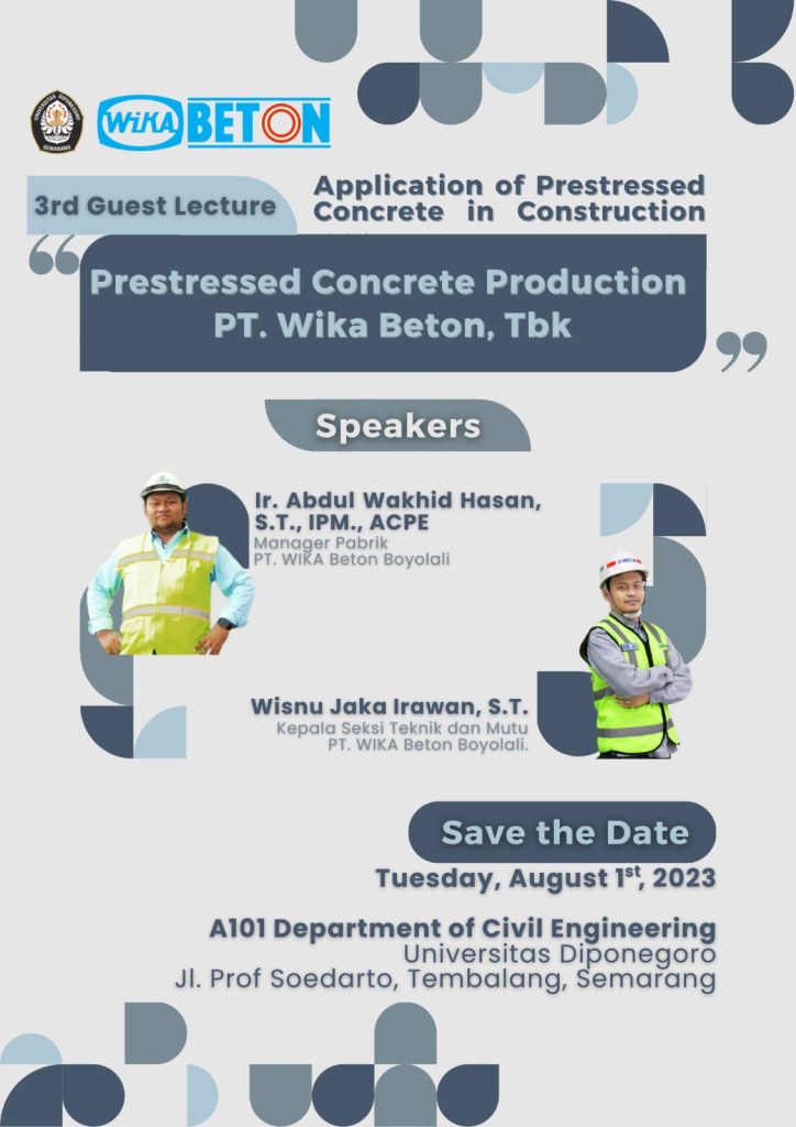 sipil.ft.undip.ac.id – The Department of Civil Engineering UNDIP in collaboration with WIKA Beton is holding a guest lecture with the theme of “Application of Prestressed Concrete in Construction” which will be held on Tuesday, 1 August 2023, at 08.00 WIB in room A101 of Departement of Civil Engineering .
