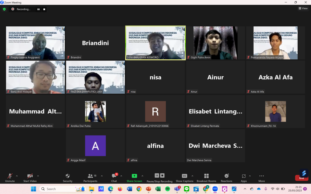 sipil.ft.undip.ac.id – Beberapa tim yang terdiri dari mahasiswa dan dosen pembimbing tercatat akan mengikuti perlombaan KJI dan KBGI 2023. Serangkaian persiapan dilakukan untuk dapat memberikan hasil terbaik dari dua perlombaan tersebut. Mulai dari koordinasi awal, sharing ilmu dengan pemenang tahun 2022 dari Polines dan UNJ, mengikuti sosialisasi yang diselenggarakan oleh puspresnas, hingga pelatihan software yang menunjang desain jembatan dan gedung.